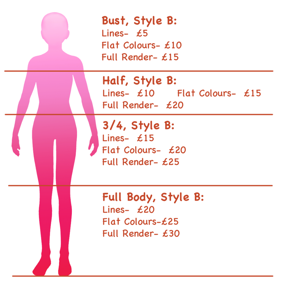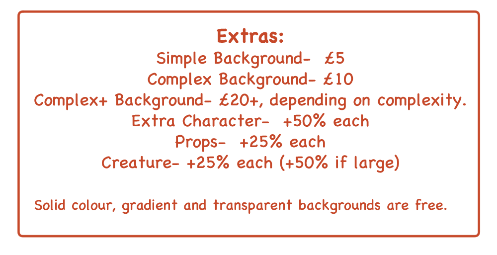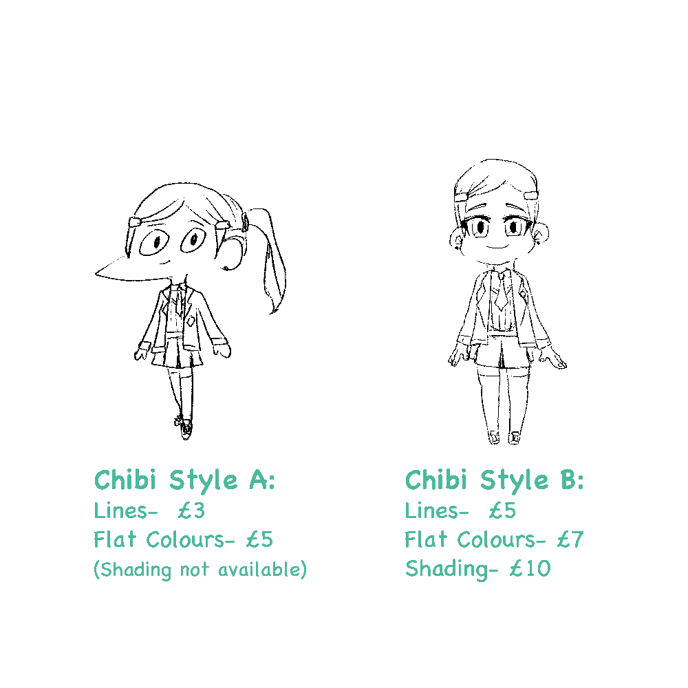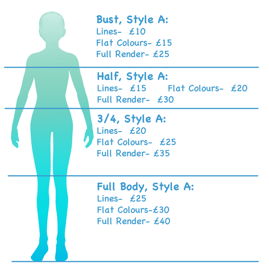 Base price starts at £35 PLUS the cost of the style and colouring of your choice (A,B or chibi).If you want the back and side references, then it'll be an additional 25% of the final cost.No need for an additional background cost.